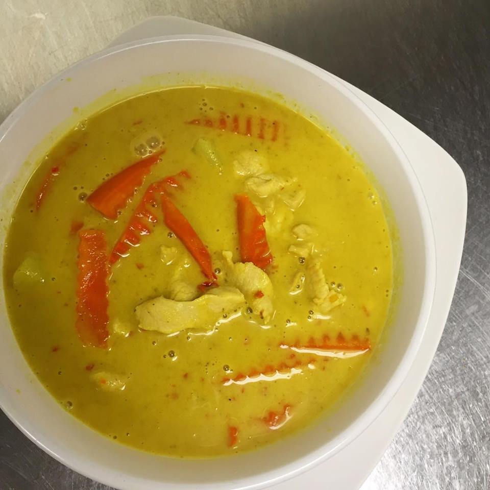 (chicken, pork, beef, shrimp or tofu) Sliced pieces of meat prepared with yellow curry paste, potato, onion and carrots.