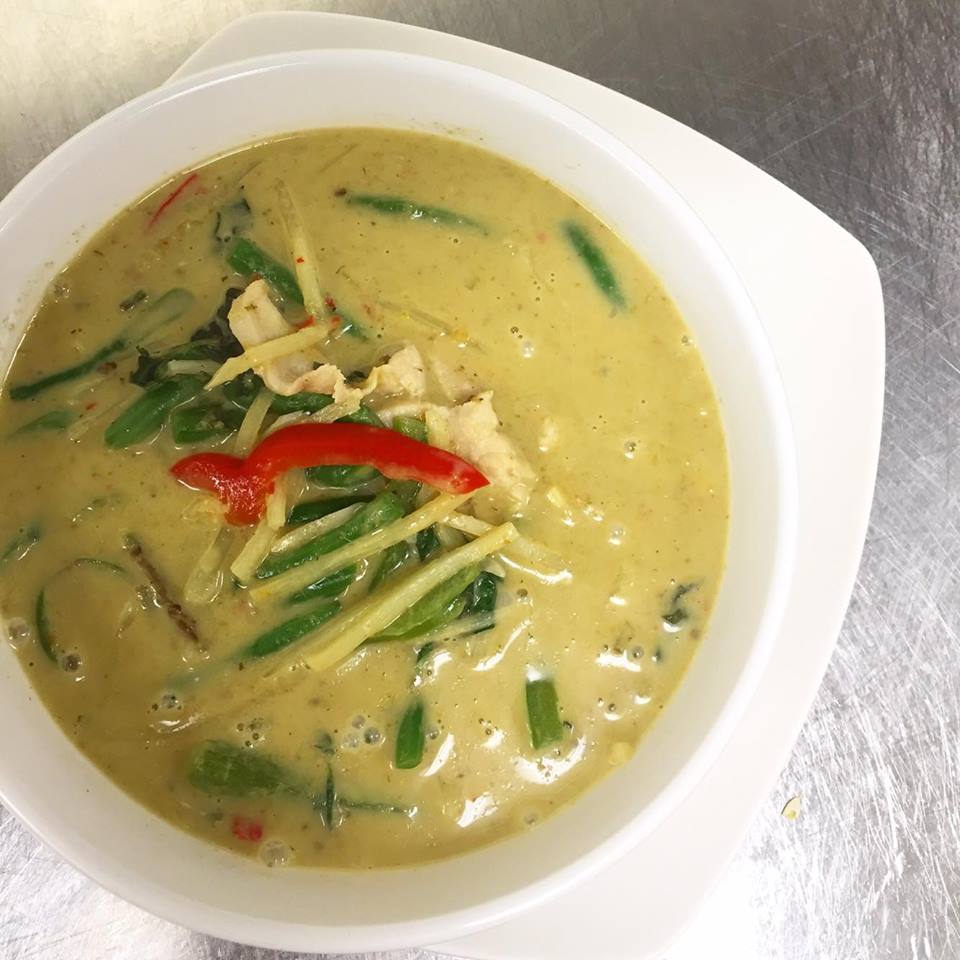 (chicken, pork, beef, shrimp or tofu) Sliced pieces of meat prepared with green curry paste, bamboo shoots, Thai eggplant, green beans, coconut milk, bell peppers and fresh Thai basil.