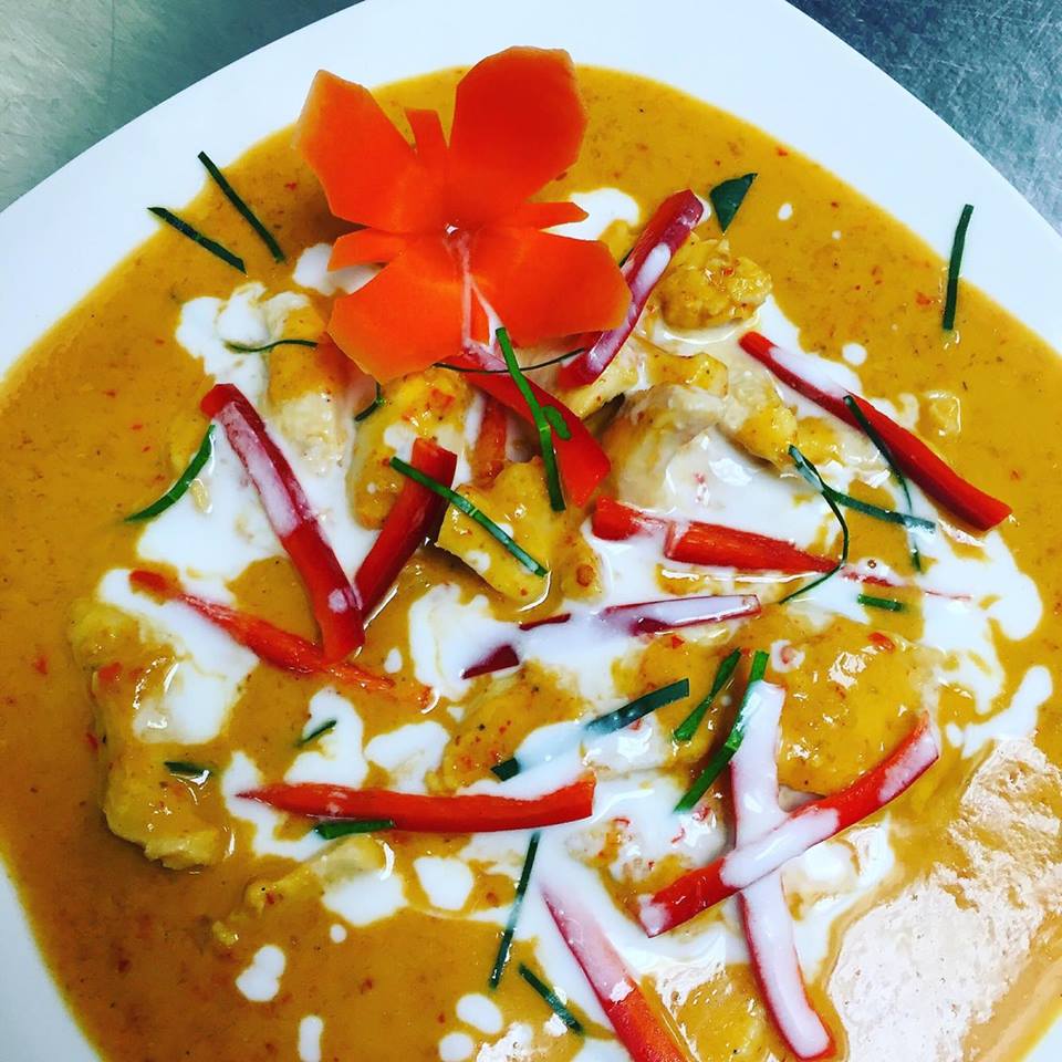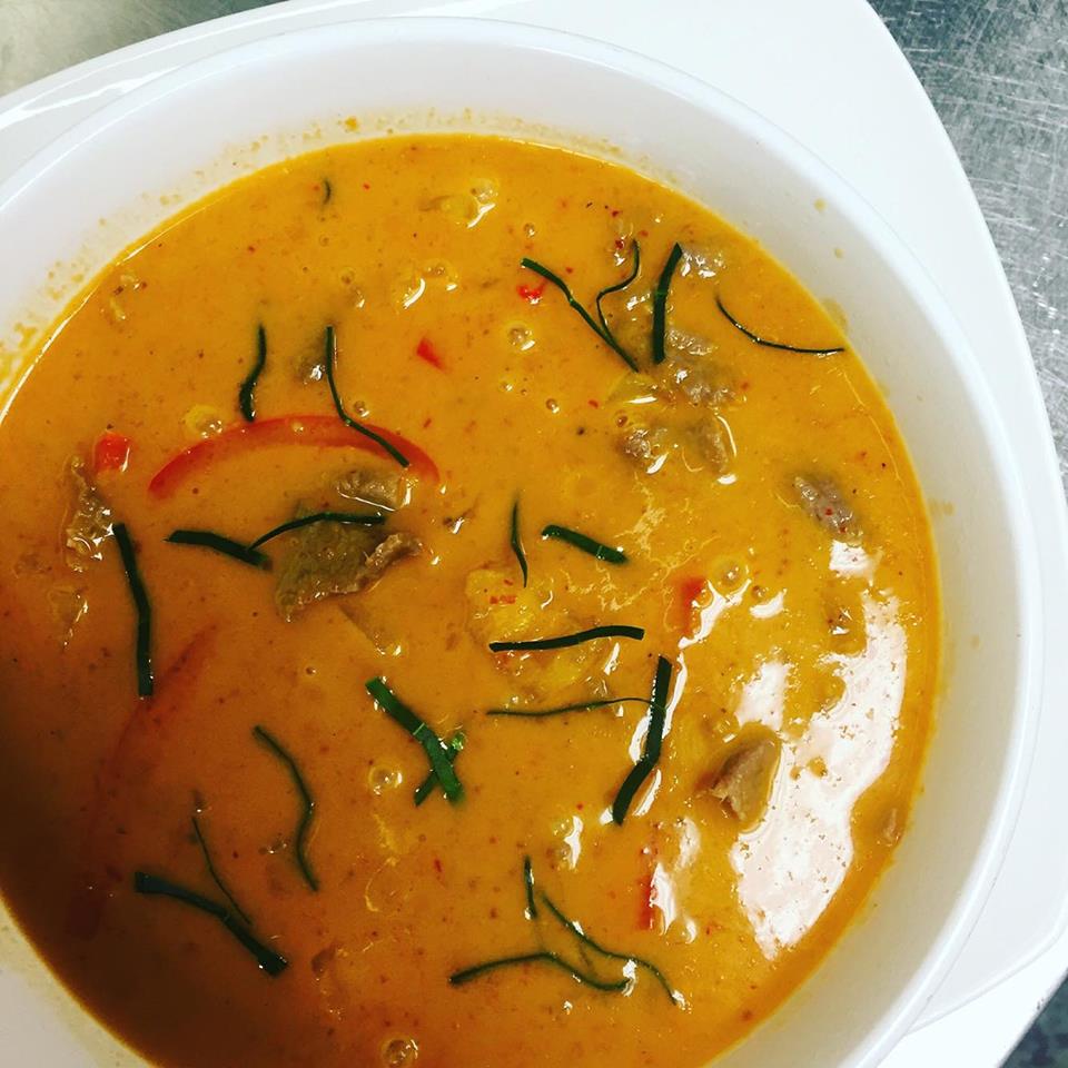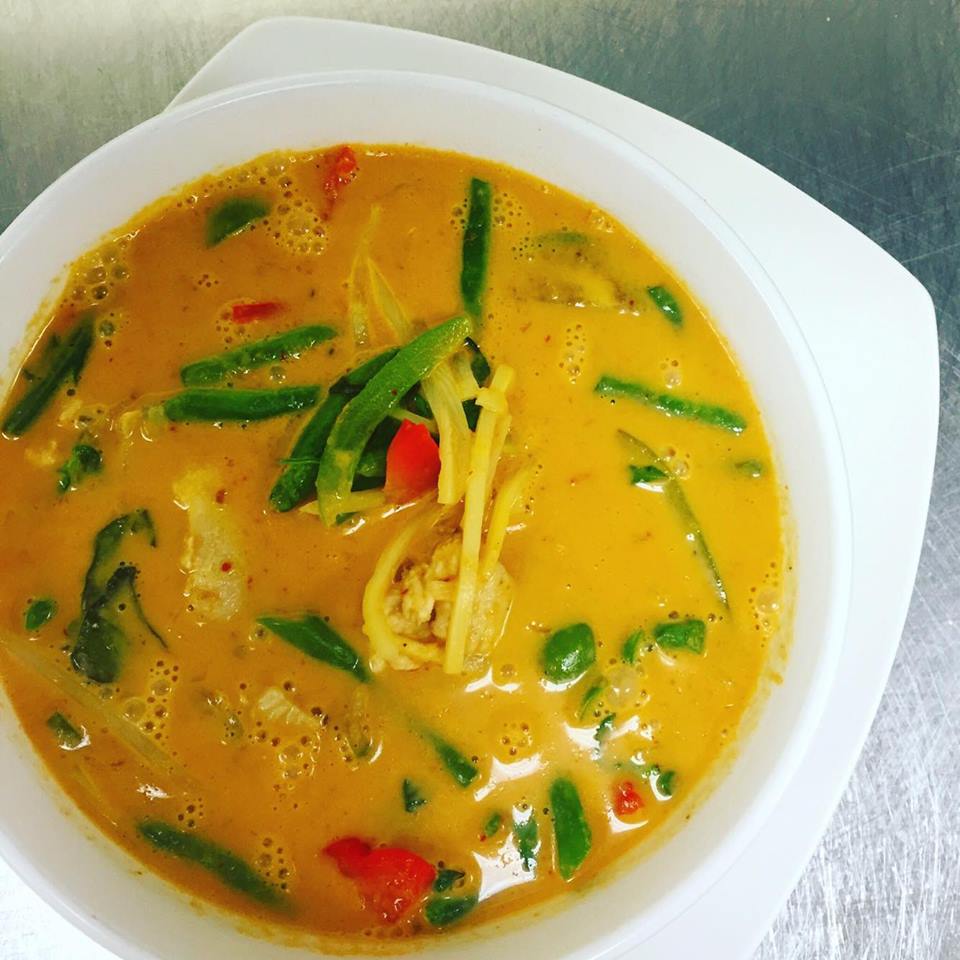 (chicken, pork, beef, shrimp or tofu) Sliced pieces of meat prepared with red curry paste, bamboo shoots, Thai eggplant, green beans, coconut milk, bell peppers and fresh Thai basil.