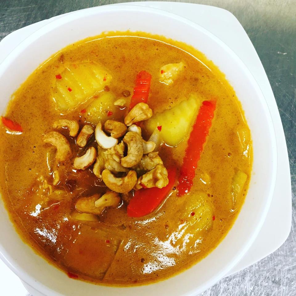 (chicken, pork, beef, shrimp or tofu) Choice of meat prepared with coconut milk, massaman curry paste, potatoes, carrots, peanuts and topped with cashew nuts.