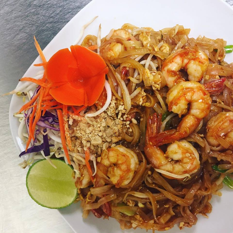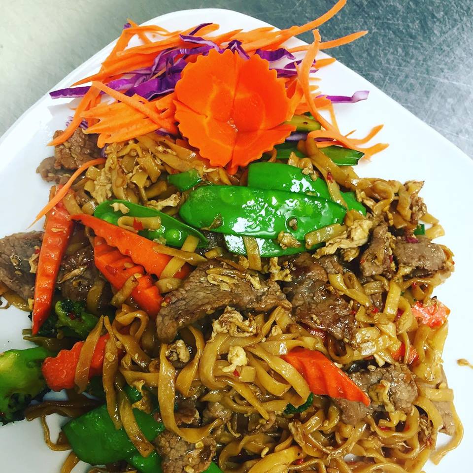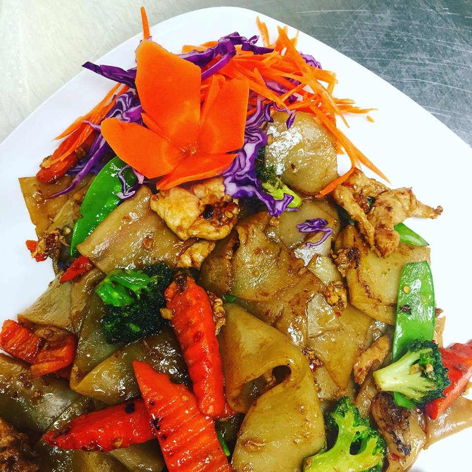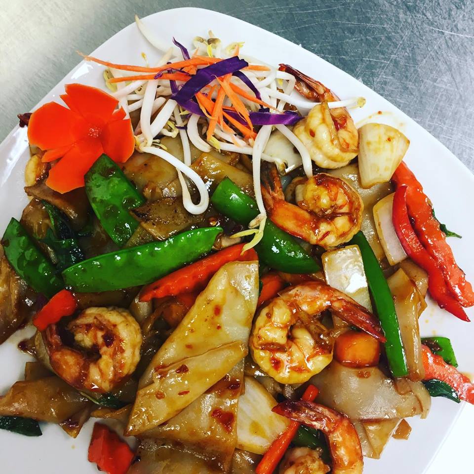 (chicken, pork, beef, shrimp or tofu) Stir-fried wide rice noodles with choice of meat prepared with mushrooms, snow peas, carrots, tomatoes, onions, bell peppers and fresh Thai basil.