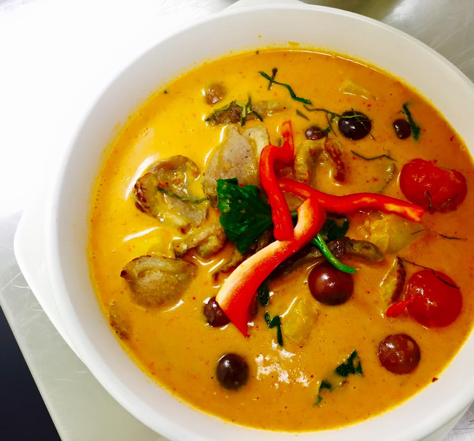 Roasted duck prepared with red curry paste, coconut milk, cherry tomatoes, grapes, pineapple and fresh Thai basil.