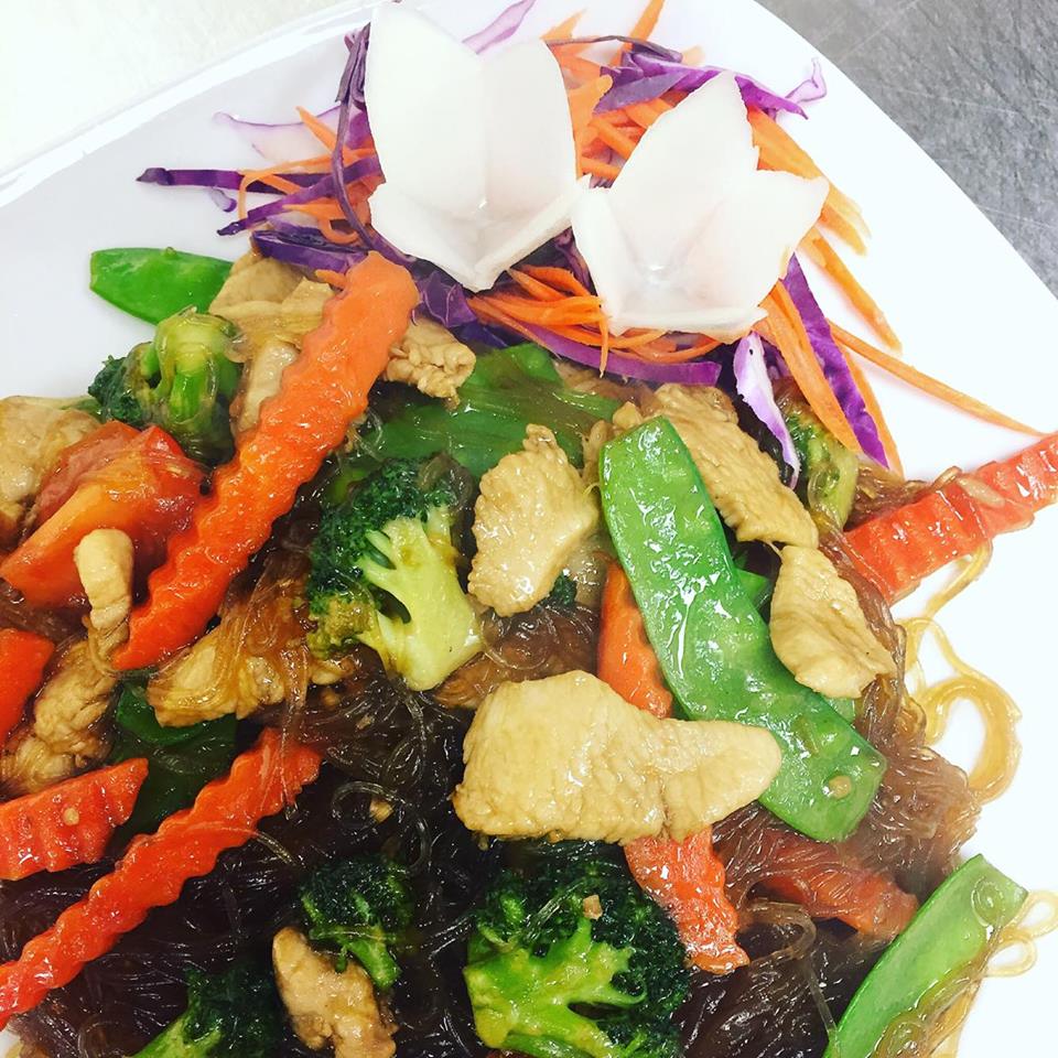 (chicken, pork, beef, shrimp or tofu) Stir-fried glass noodle with onions, scallions, broccoli, snow peas, tomatoes and carrots with thick soy sauce.