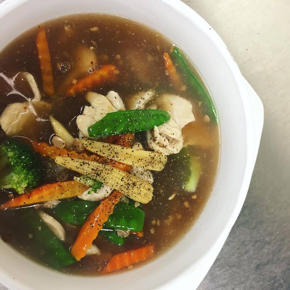 (chicken, pork, beef, shrimp or tofu) Pan-fried wide rice noodles with baby corn, broccoli, carrots, snow peas and choice of meat in a thick starch gravy sauce.