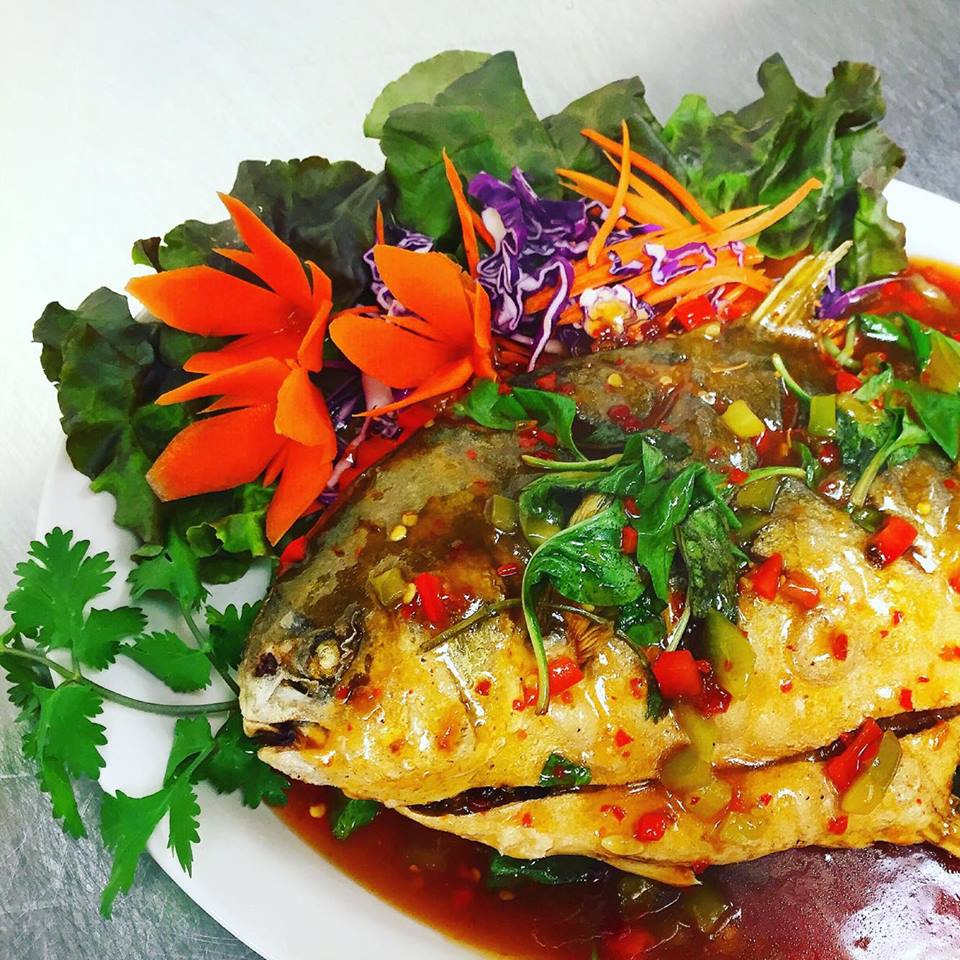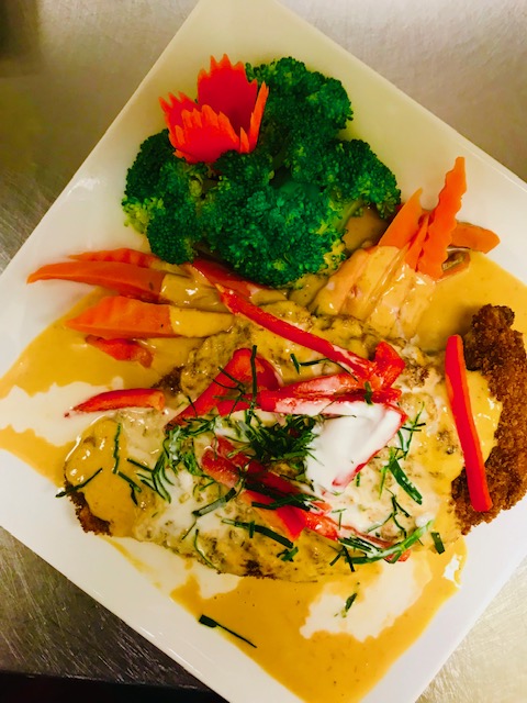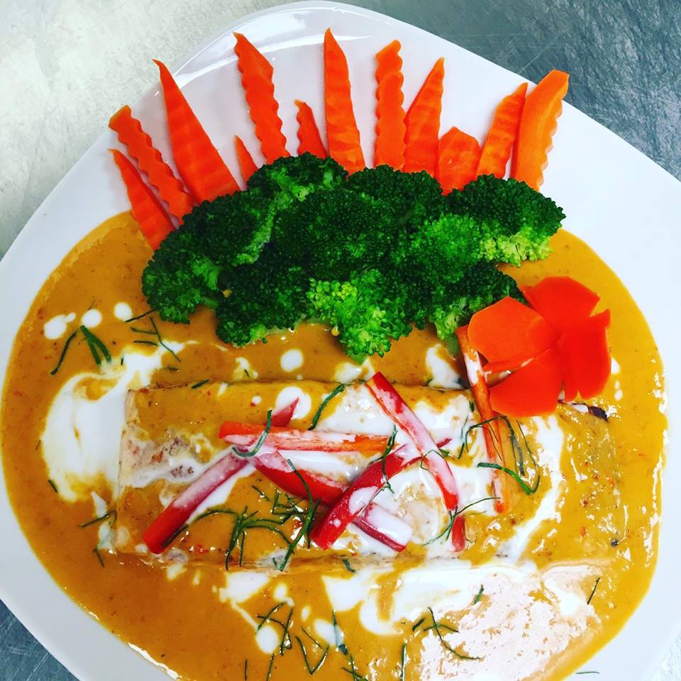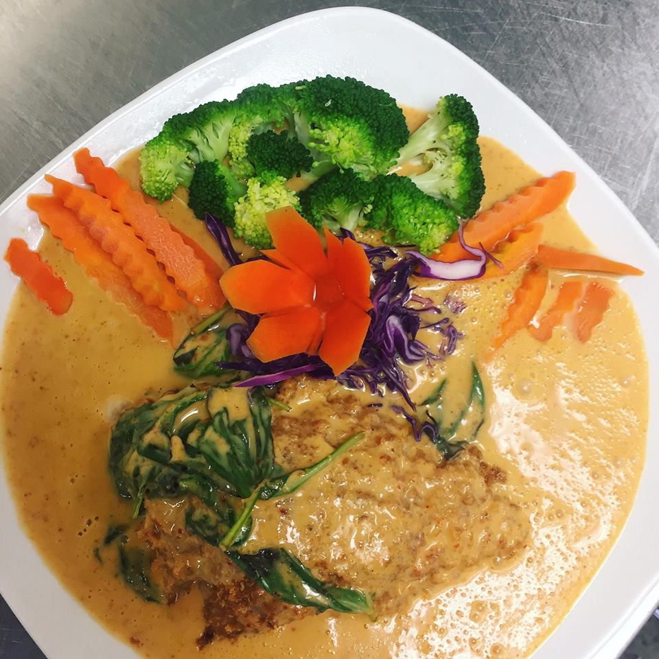 Breaded fillet catfish, steamed broccoli and carrots with choo chee sauce, topped with coconut milk, red bell pepper and kaffir lime leaves.