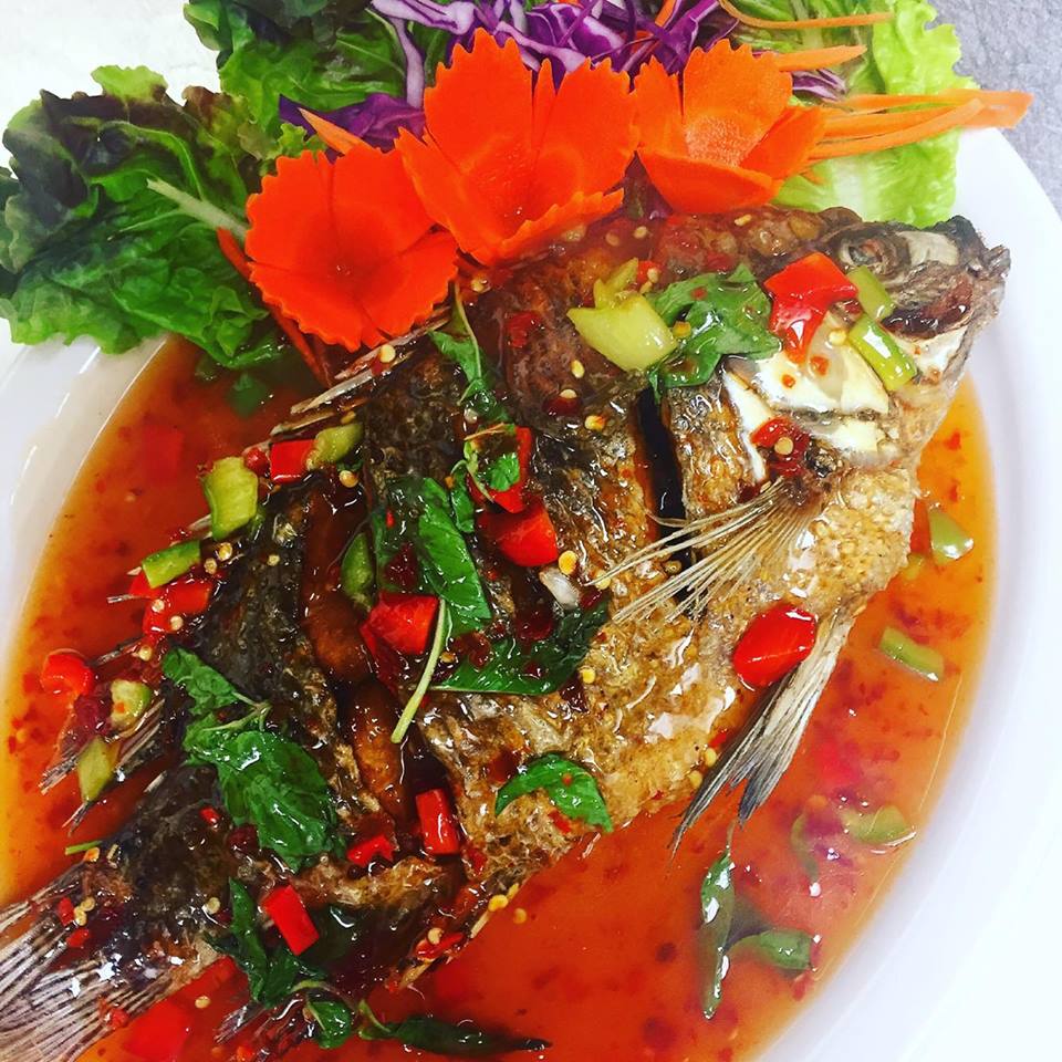 RAD PRIK SAUCE - Topped with spicy red chili sauce, bell pepper, fresh Thai basil and kffir leaves.