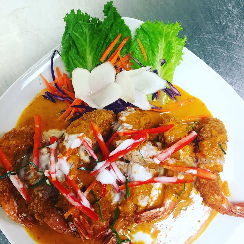 Breaded shrimp, steamed broccoli and carrots with choo chee sauce, topped with coconut milk, red bell pepper and kaffir lime leaves.