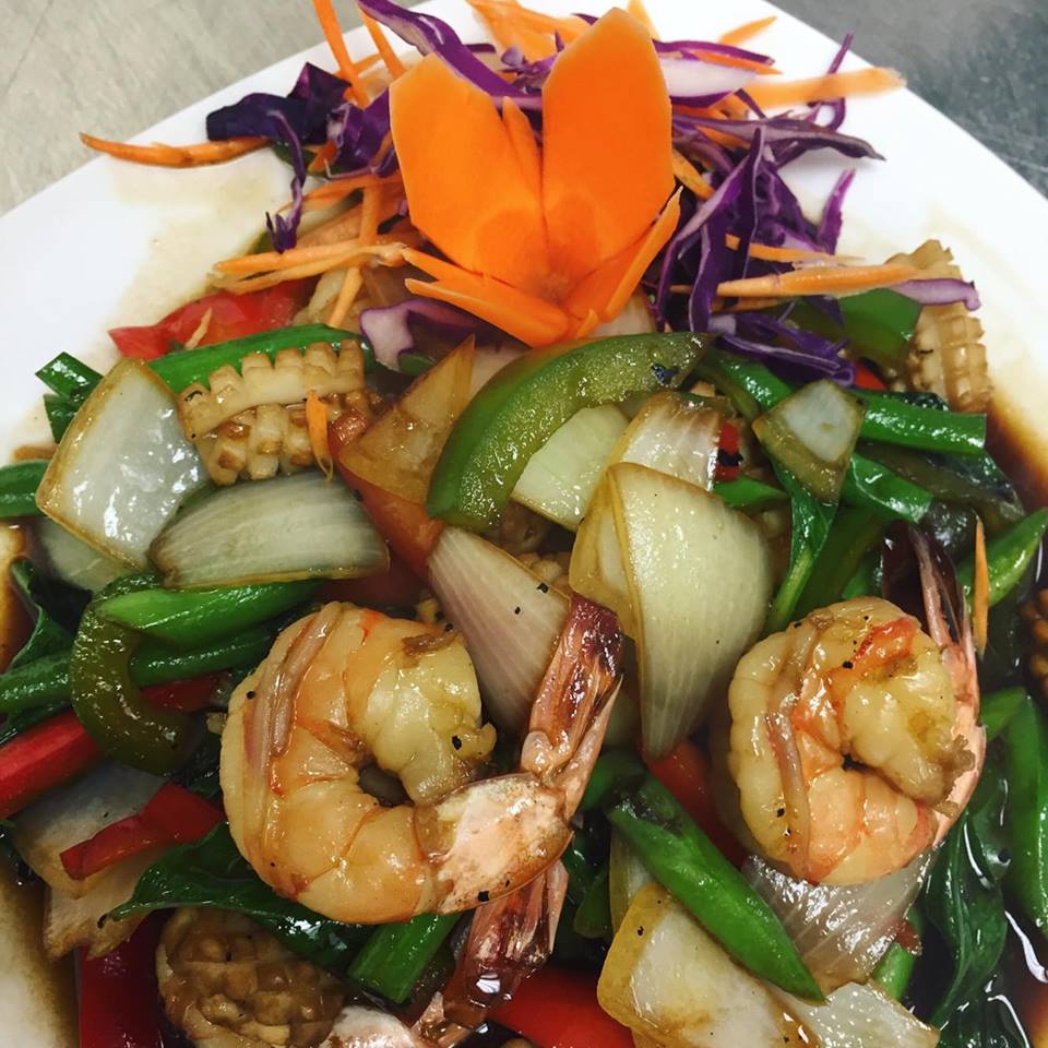Spicy stir-fried seafood (calamari, mussels and shrimp) with bell pepper, onions, mushroom and fresh Thai basil.