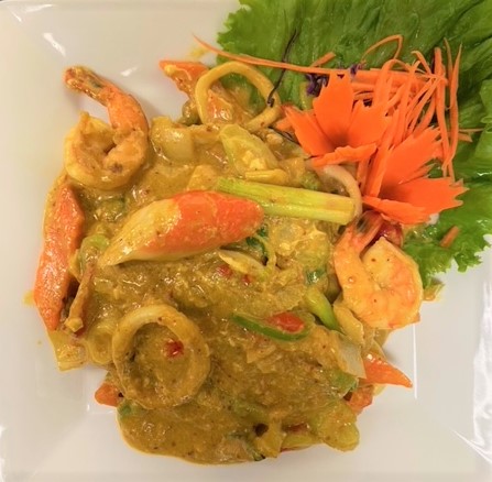 Stir-fried seafood (catfish, shrimp, calamari and crab stick) with curry powder and chili paste, egg, celery, scallions, onions and garlic.