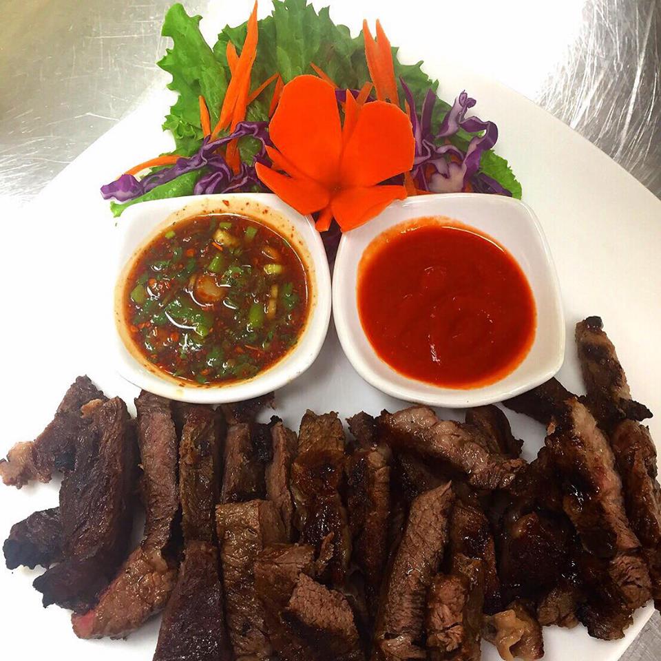 Thai style grilled steak served with dried chili sauce and sriracha sauce.