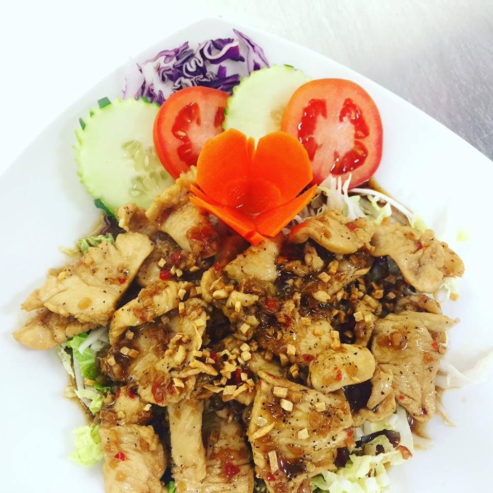 (chicken, pork or beef) Stir-fried choice of meat prepared with fresh garlic and black pepper.