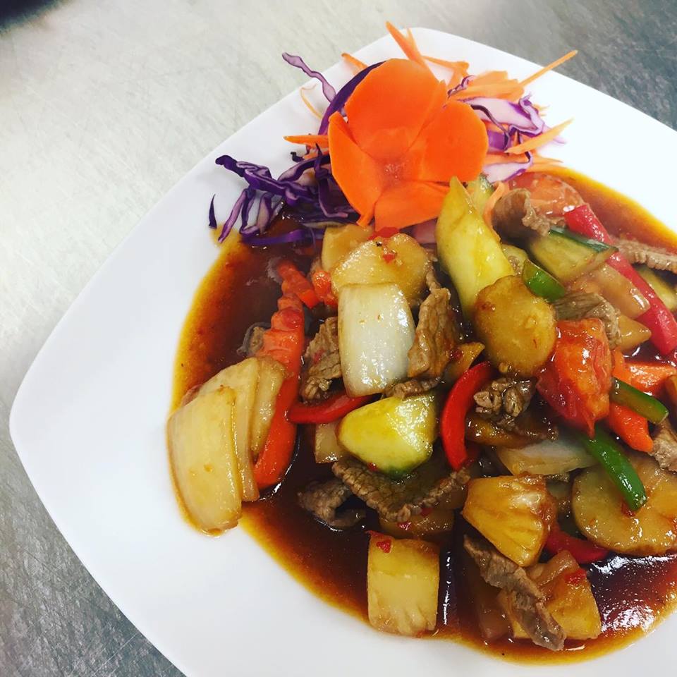 (chicken, pork, beef, shrimp or tofu) Stir-fried choice of meat with pineapple, cucumbers, carrots, tomatoes, water chestnuts, bell peppers and onions in homemade sweet and sour tomato sauce.