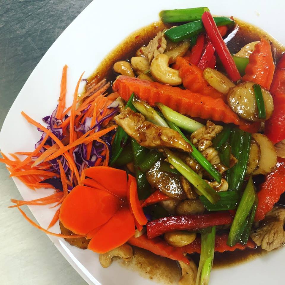(chicken, pork, beef, shrimp or tofu) Choice of meat stir-fried with cashew nuts, water chestnuts, carrots, scallions, bell peppers and fresh garlic.