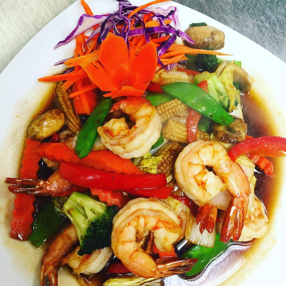 (chicken, pork, beef, shrimp or tofu) Stir-fried choice of meat prepared with seasonal mixed vegetables, soy sauce and fresh garlic.