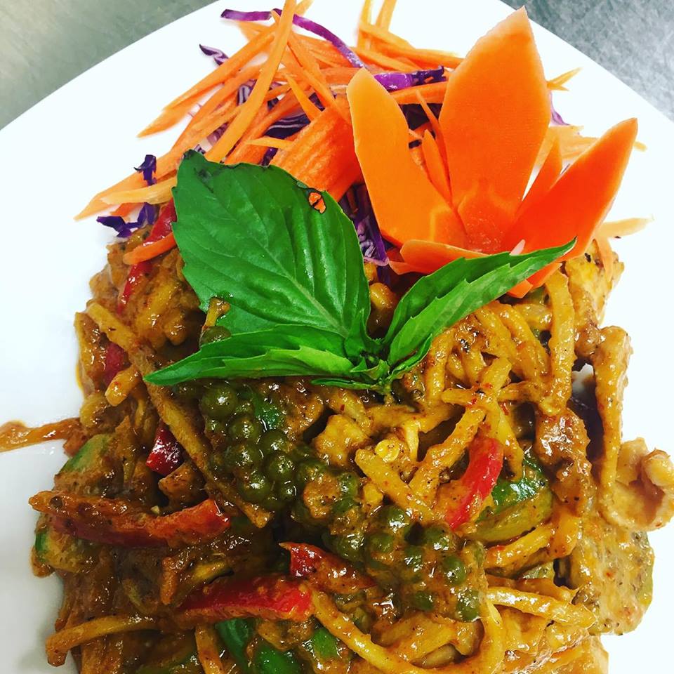 (chicken, pork, beef, shrimp or tofu) choice of meat stir-fried with red curry paste, coconut milk, Thai eggplant, bamboo, young peppercorn and fresh Thai basil.