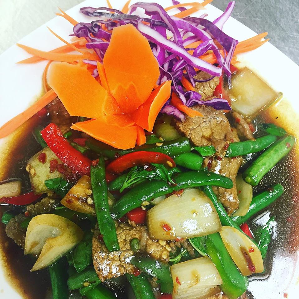 (chicken, pork, beef, shrimp or tofu) Stir-fried choice of meat prepared with bell peppers, green beans, onions and fresh Thai basil.