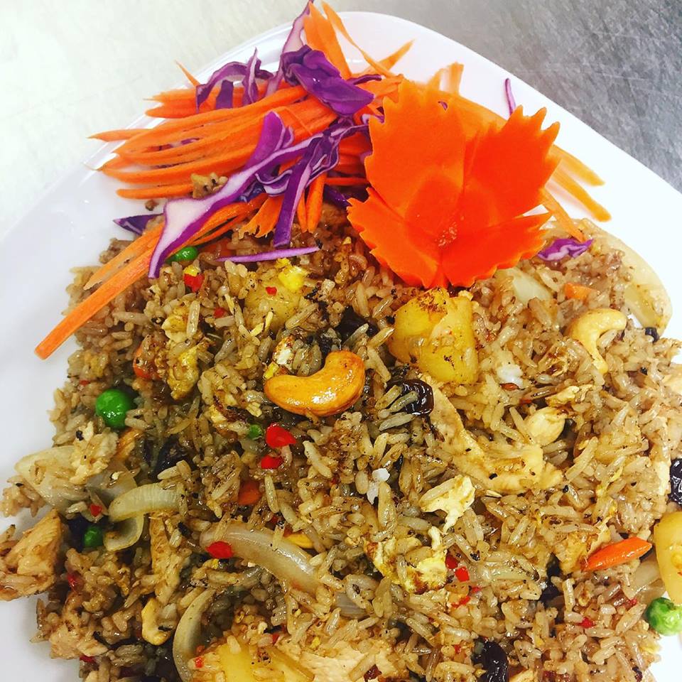 (chicken, pork, beef, shrimp or tofu) Thai fried rice with choice of meat prepared with onions, pineapple, cashew nuts, raisins, egg, carrots and peas.
