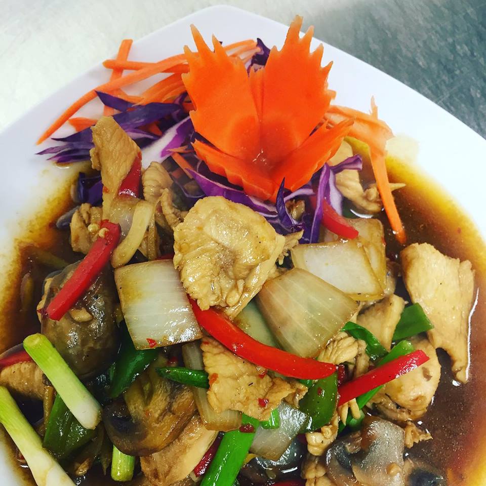 (chicken, pork, beef, shrimp or tofu) Stir-fried choice of meat prepared with ginger, bell peppers, onions, mushroom and scallions.