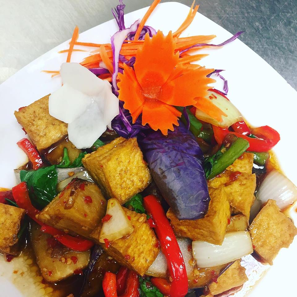 (chicken, pork, beef, shrimp or tofu) Stir-fried eggplant with sweet bell peppers, onions, and fresh Thai basil.