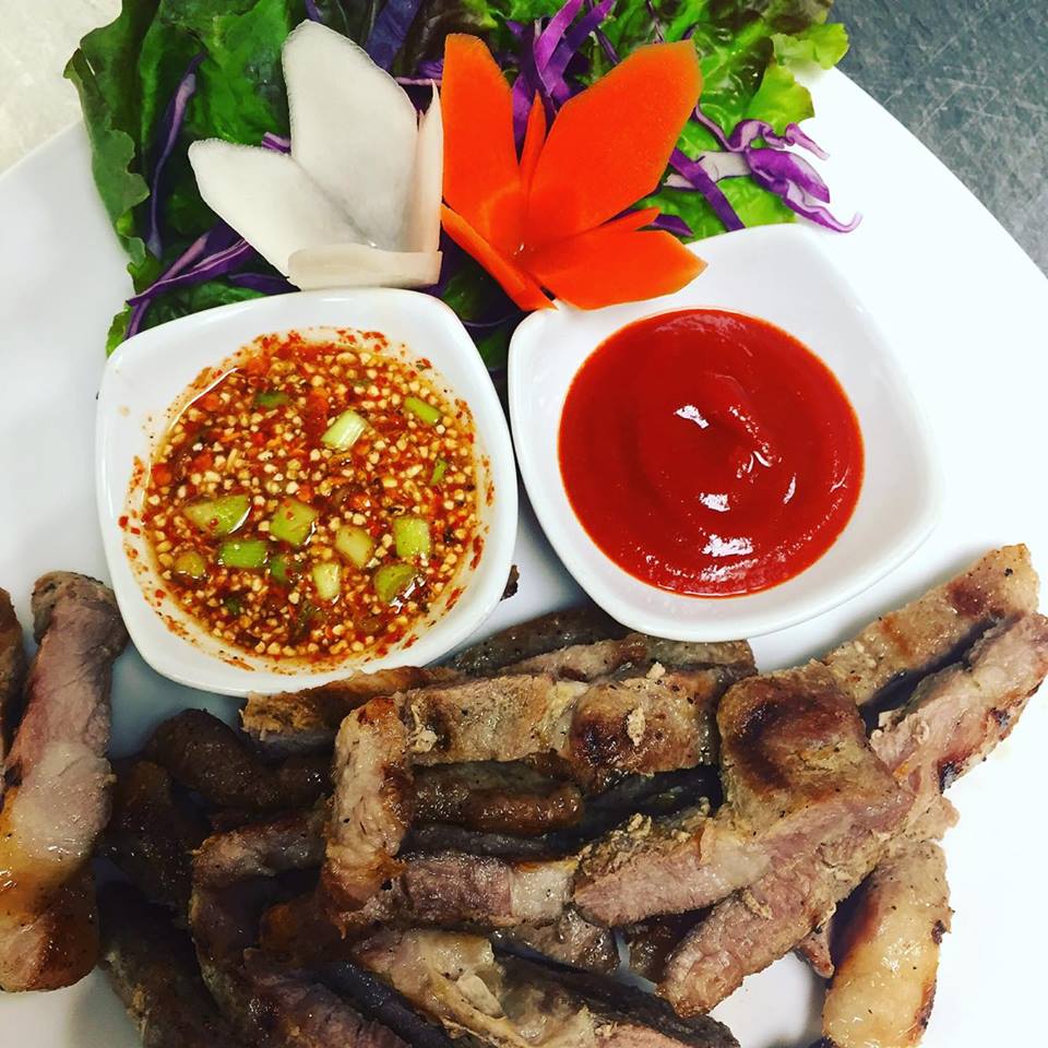 Thai style grilled pork served with dried chili sauce and Sriracha sauce.