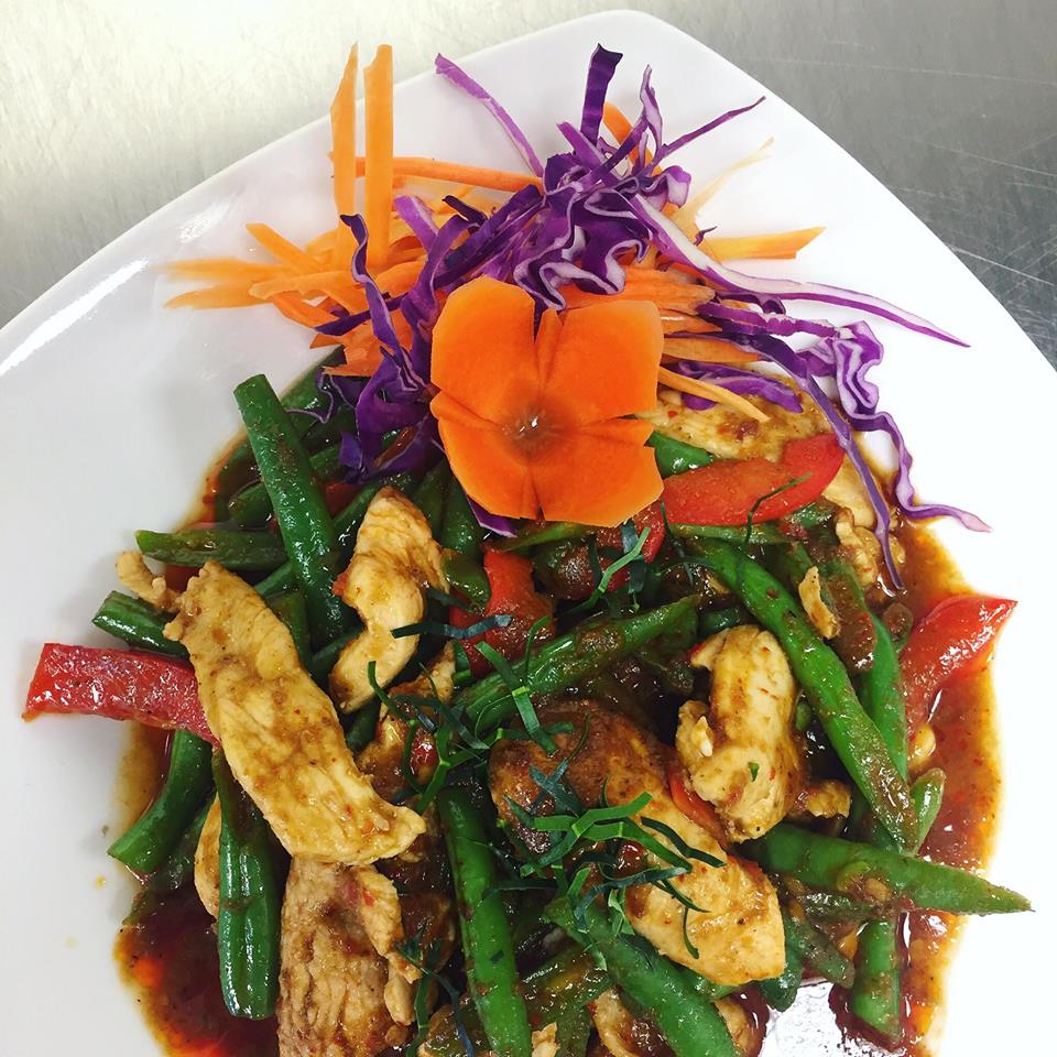 (chicken, pork, beef, shrimp or tofu) Stir-fried choice of meat prepared with green beans, red curry pasted and kaffir lime leaves.