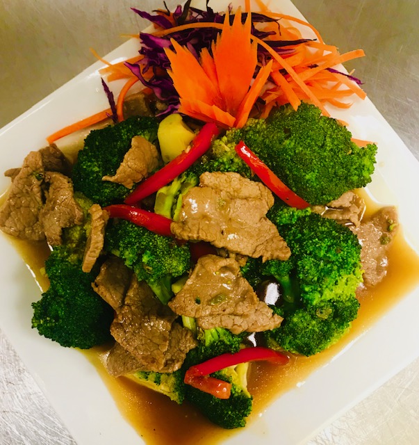 Stir-fried beef prepared with broccoli, bell peppers and oyster sauce.