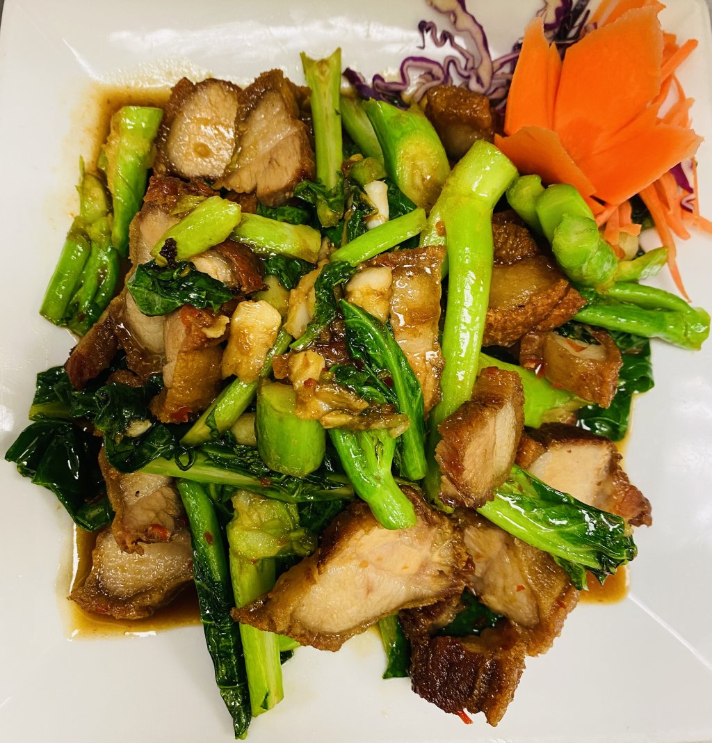 Stir-fried crispy pork belly with Asian young kale green and fresh garlic.