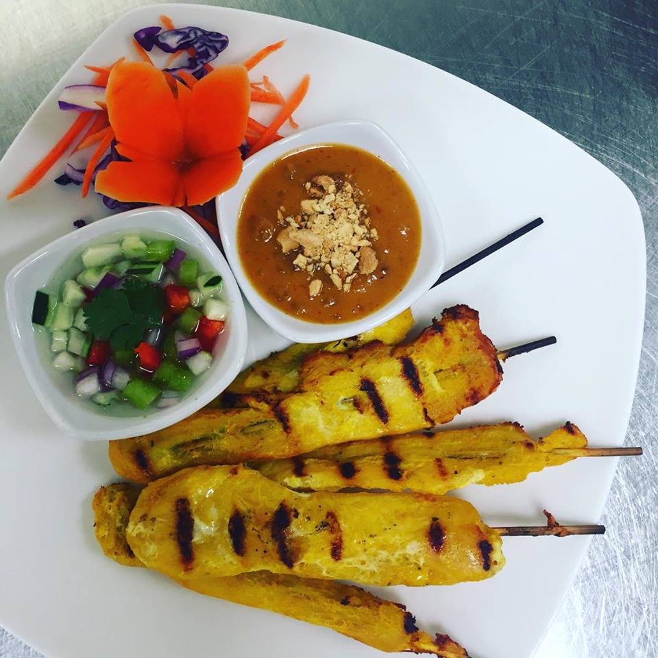 Grilled skewers of tender chicken marinated in curry powder and coconut milk. Served with peanut sauce, and cucumber salad.