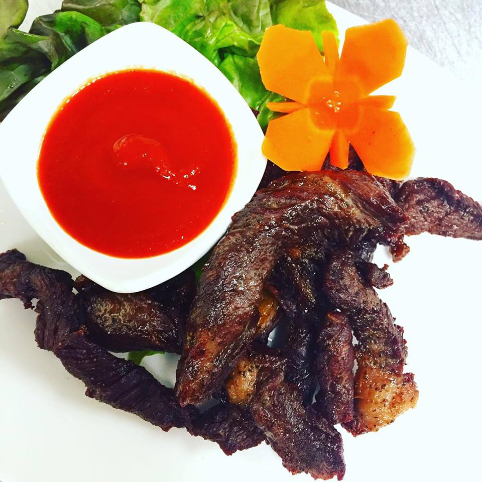 Fried sun dried beef with Sriracha sauce.