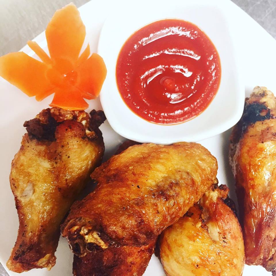 Deep fried chicken wings marinated in Thai seasoning. Served with sriracha sauce.