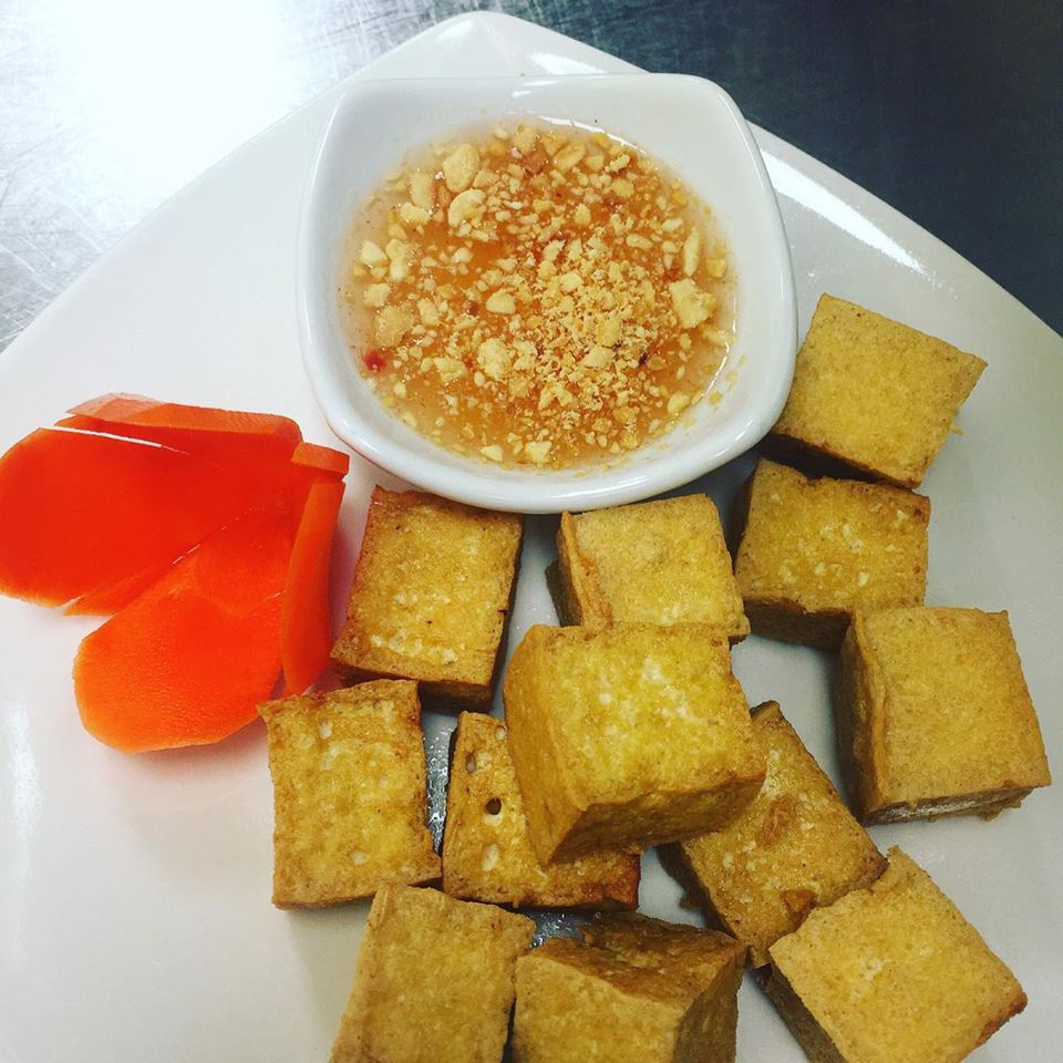 Deep fried tofu until crispy and golden-brown. Served with sweet chili sauce topped with ground peanuts.