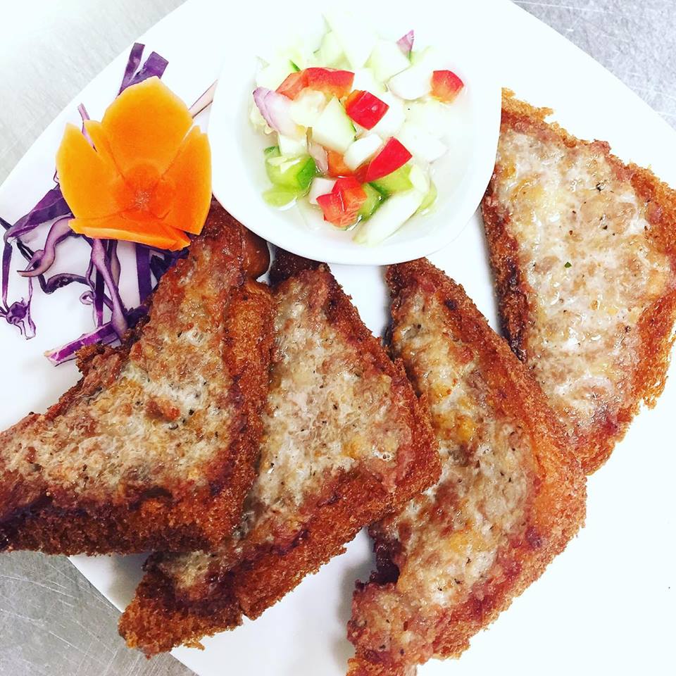 Sliced bread topped with ground pork and deep fried. Served with cucumber salad.