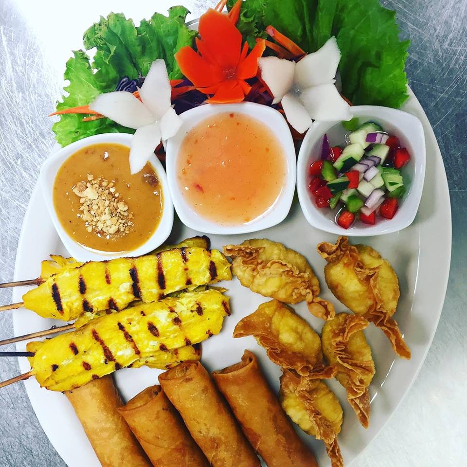Choose three different: Spring rolls, fried tofu, Chicken satay, Thai toast, Vegetable tempura, Thai chicken wings, or Crab Rangoon.