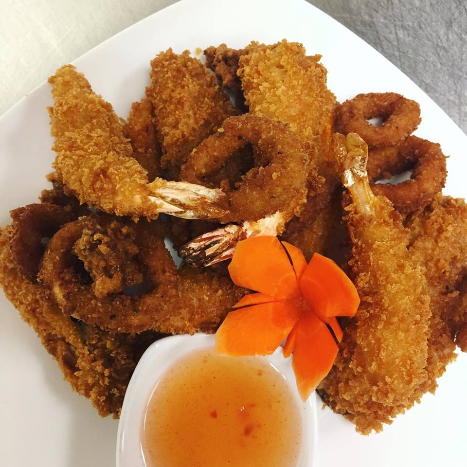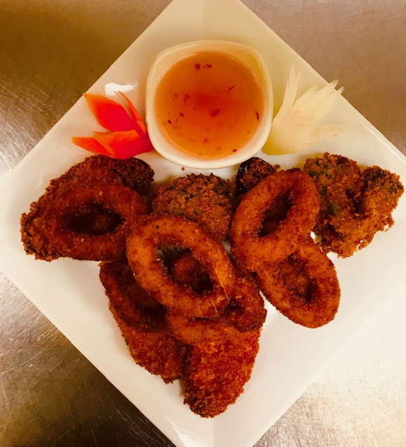 Deep fried breaded calamari and vegetable served with sweet chili sauce.
